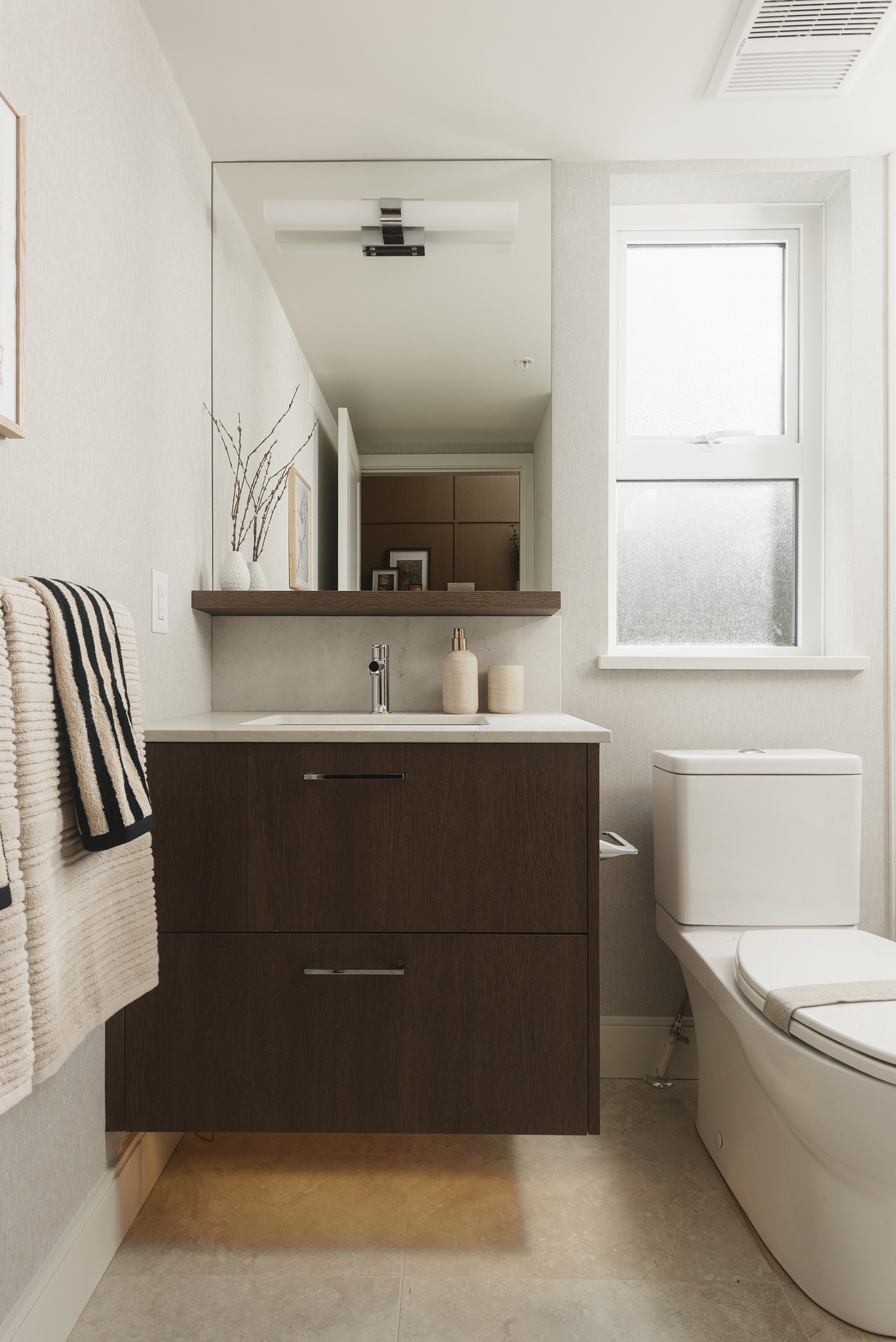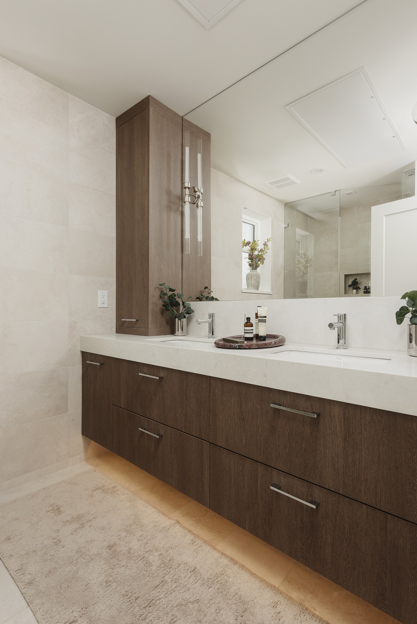 Spa-inspired quartz countertops with under-mount sinks