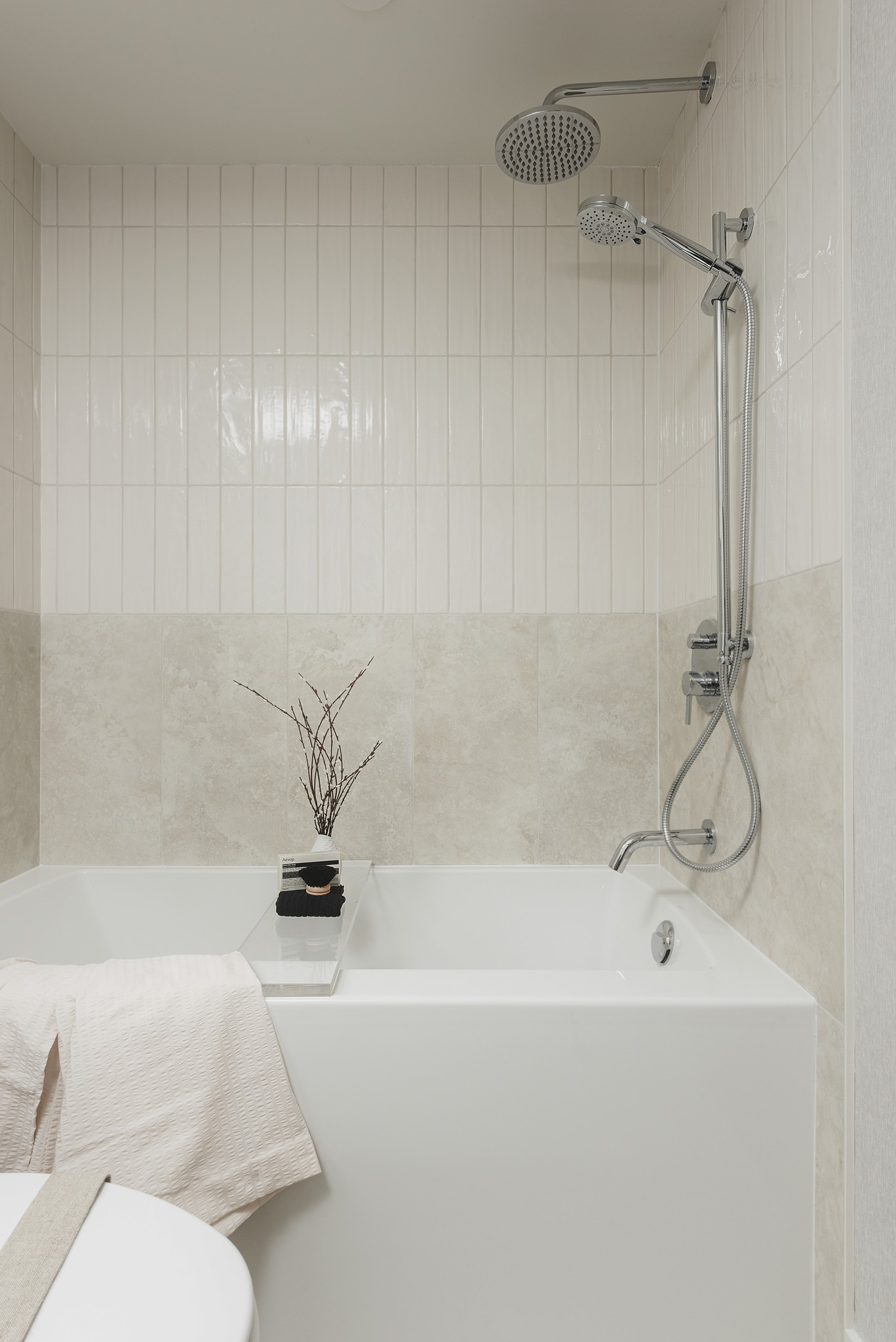Polished Kohler chrome fixtures, including rain shower and hand shower set